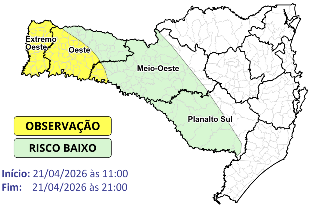Nesta terça-feira (21), as instabilidades retornam na metade oeste de Santa Catarina. Por isso, o risco é BAIXO nas áreas em VERDE e MODERADO nas áreas em AMARELO para ocorrências associadas a alagamentos pontuais, destelhamentos, queda de galhos e árvores e danos na rede elétrica.