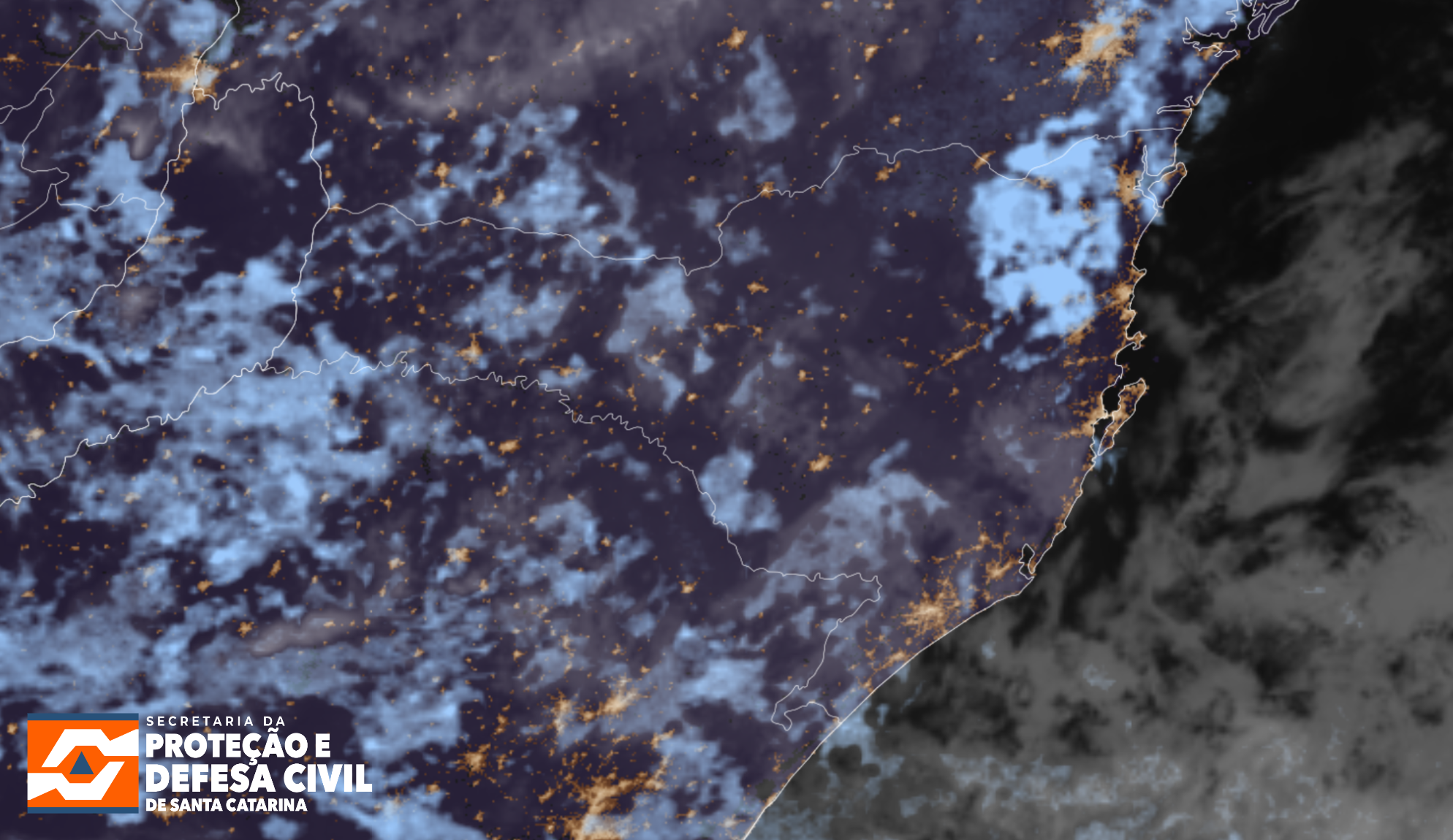 Figura: Imagem do satélite GOES-19, produto GeoColor, às 21h20, horário local. Fonte: RAMMB/CIRA, adaptado por SDC/SC.