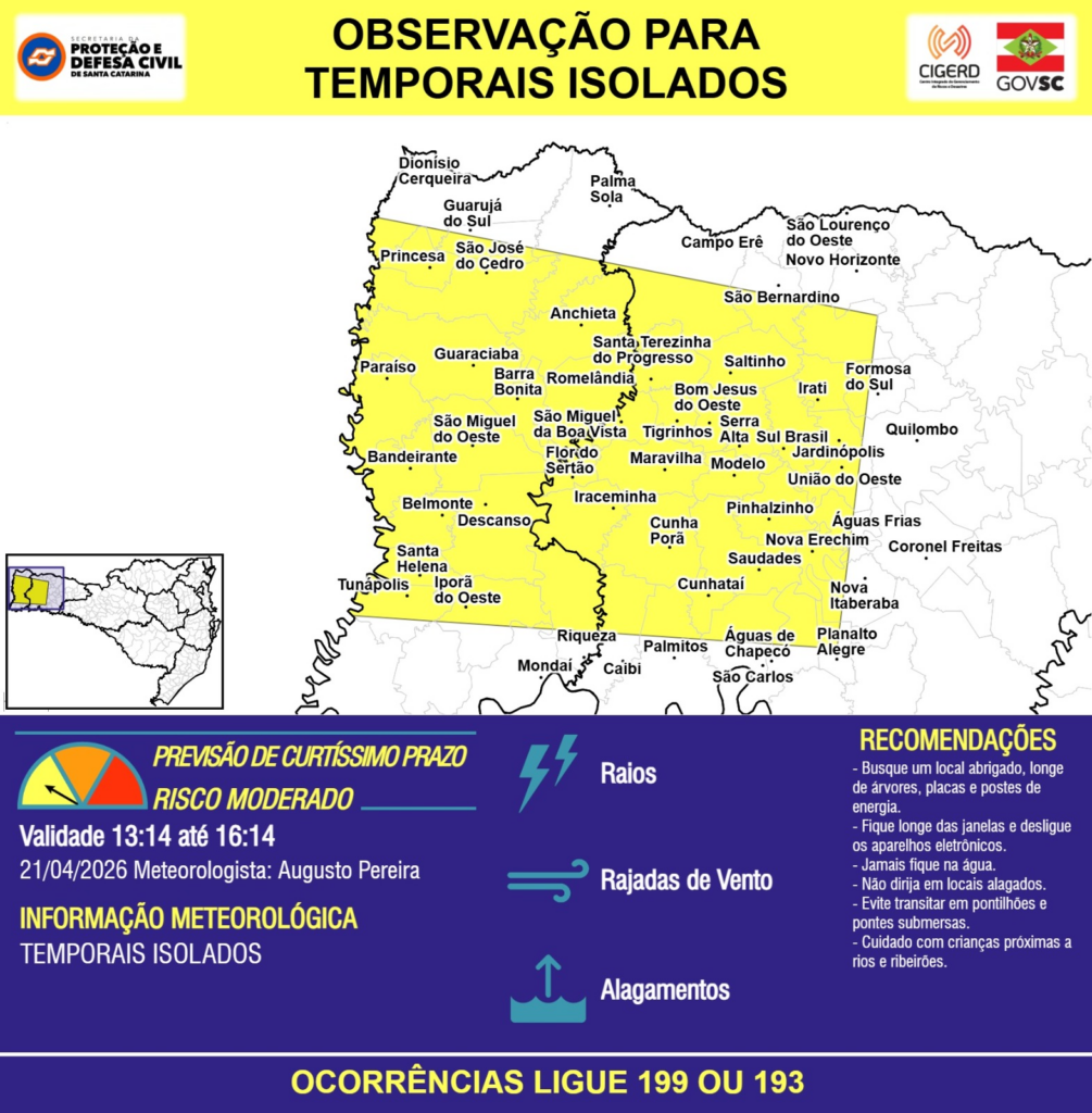 OBSERVAÇÃO – 21/04 13:14 – TEMPORAIS ISOLADOS com RAIOS, RAJADAS DE VENTO e ALAGAMENTOS pontuais para as regiões do Extremo Oeste e Oeste nas próximas 3 horas. Ocorrências ligue 199 ou 193.