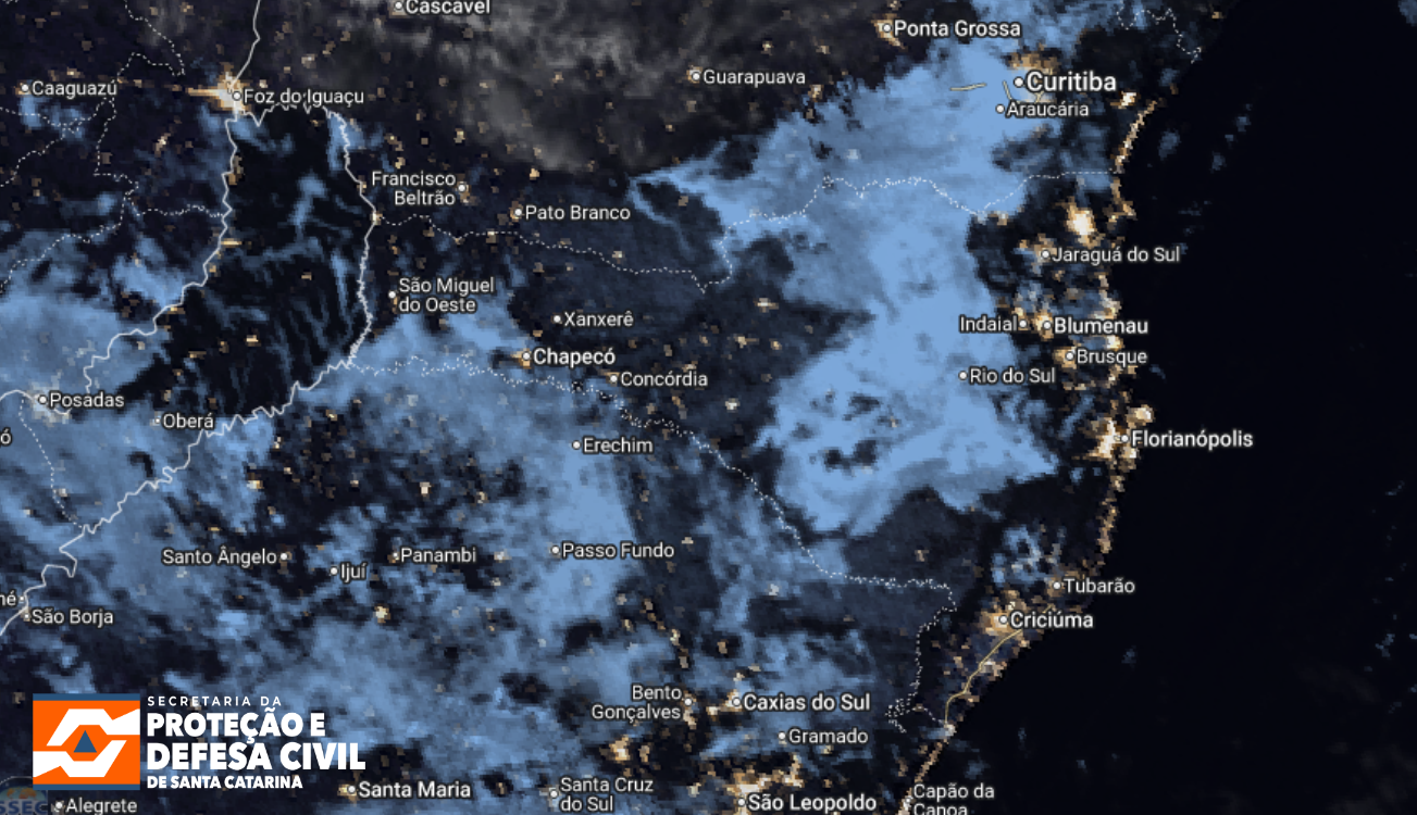 A quarta-feira (22) vai começando com tempo estável e nuvens baixas no Grande Oeste, Alto Vale do Itajaí, Planalto e Litoral Norte. Nas próximas horas não são esperados eventos de chuva, por isso não há risco para ocorrências atmosféricas. No momento, as temperaturas nos Planaltos Sul e Norte e no Meio-Oeste variam entre 5°C e 17°C. No Grande Oeste, as marcas oscilam entre 16°C e 21°C. Já no Vale do Itajaí e em toda a faixa litorânea, os valores variam predominantemente entre 14°C e 22°C.