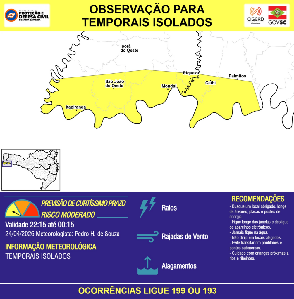 OBSERVAÇÃO – 24/04 22:15 – TEMPORAIS ISOLADOS com RAIOS, RAJADAS DE VENTO e ALAGAMENTOS pontuais para os municípios de Caibi, Iporã do Oeste, Itapiranga, Mondaí, Palmitos, Riqueza e São João do Oeste nas próximas 2 horas. Ocorrências ligue 199 ou 193.