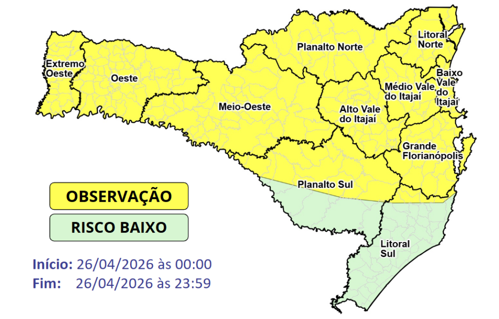 Neste domingo (26), a atuação de uma frente fria aumenta as instabilidade em Santa Catarina, favorecendo o desenvolvimento de chuva pontualmente intensa e temporais isolados em todas as regiões. O risco é BAIXO a MODERADO para ocorrências associadas a alagamentos, enxurradas pontuais, queda de galhos e árvores, destelhamentos e danos na rede elétrica.
