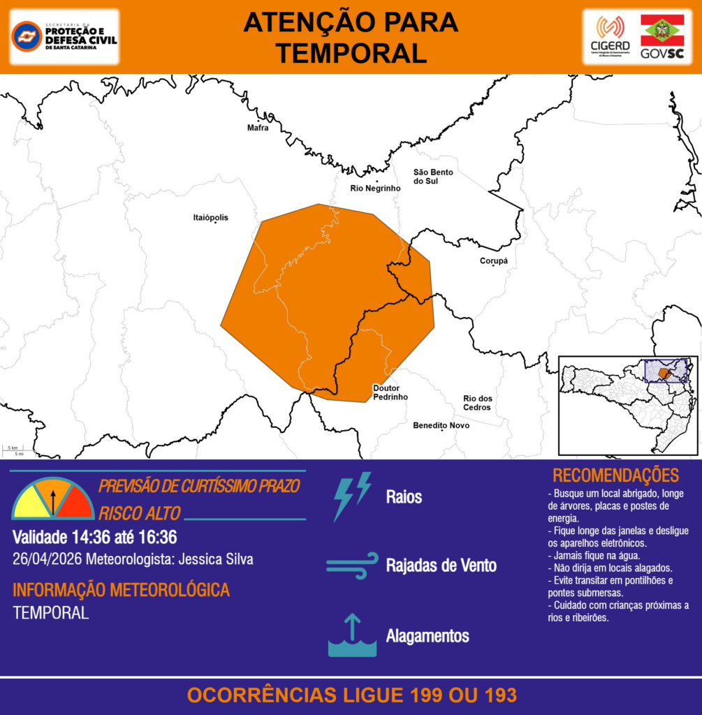 ATENÇÃO – 26/04 14:36 – TEMPORAL com RAIOS, RAJADAS DE VENTO e ALAGAMENTOS para os municípios de Benedito Novo, Corupá, Doutor Pedrinho, Itaiópolis, Mafra, Rio Negrinho, Rio dos Cedros e São Bento do Sul nas próximas 2 horas. Ocorrências ligue 199 ou 193.