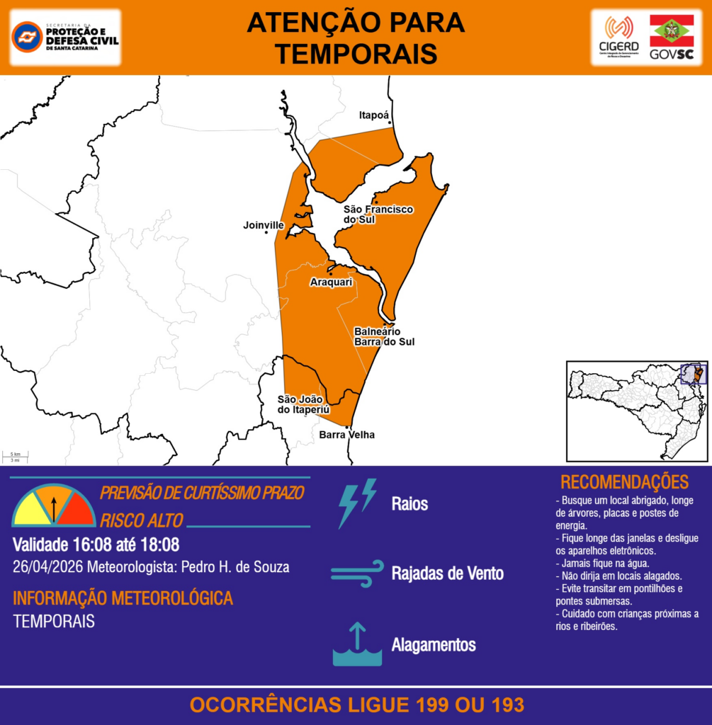 ATENÇÃO – 26/04 16:08 – TEMPORAIS com RAIOS, RAJADAS DE VENTO e ALAGAMENTOS para os municípios de Araquari, Balneário Barra do Sul, Barra Velha, Itapoá, Joinville, São Francisco do Sul e São João do Itaperiú nas próximas 2 horas. Ocorrências ligue 199 ou 193.