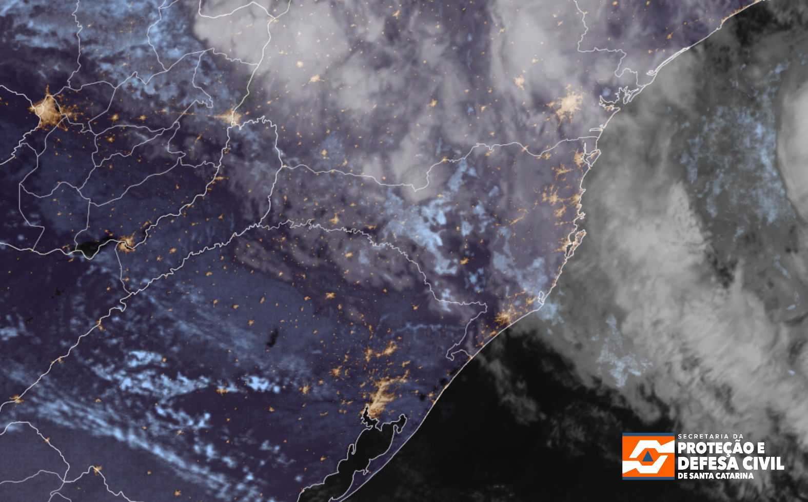 O domingo (26) foi marcado por tempo instável em toda Santa Catarina devido a atuação de uma frente fria, com chuva mais persistente entre a manhã e início da tarde e temporais isolados entre a tarde e início da noite. No decorrer da noite os temporais perderam força, mas ainda há registros de chuva no norte e leste catarinense. As temperaturas ficaram mais amenas em grande parte do estado, com máximas entre 19 e 25°C. Apenas em áreas do Oeste e do Litoral Sul é que as temperaturas chegaram a 27/28°C. No momento os termômetros marcam entre 17 e 21°C em todo o estado, com valores menores nas áreas mais altas da serra. Nas próximas horas, o céu ainda permanece com muitas nuvens e há condições para chuva fraca a pontualmente moderada especialmente nas áreas de divisa com o PR e no Litoral, mas que deve cessar no decorrer da madrugada, conforme a frente fria avança. O risco é baixo para ocorrências associadas a alagamentos pontuais.