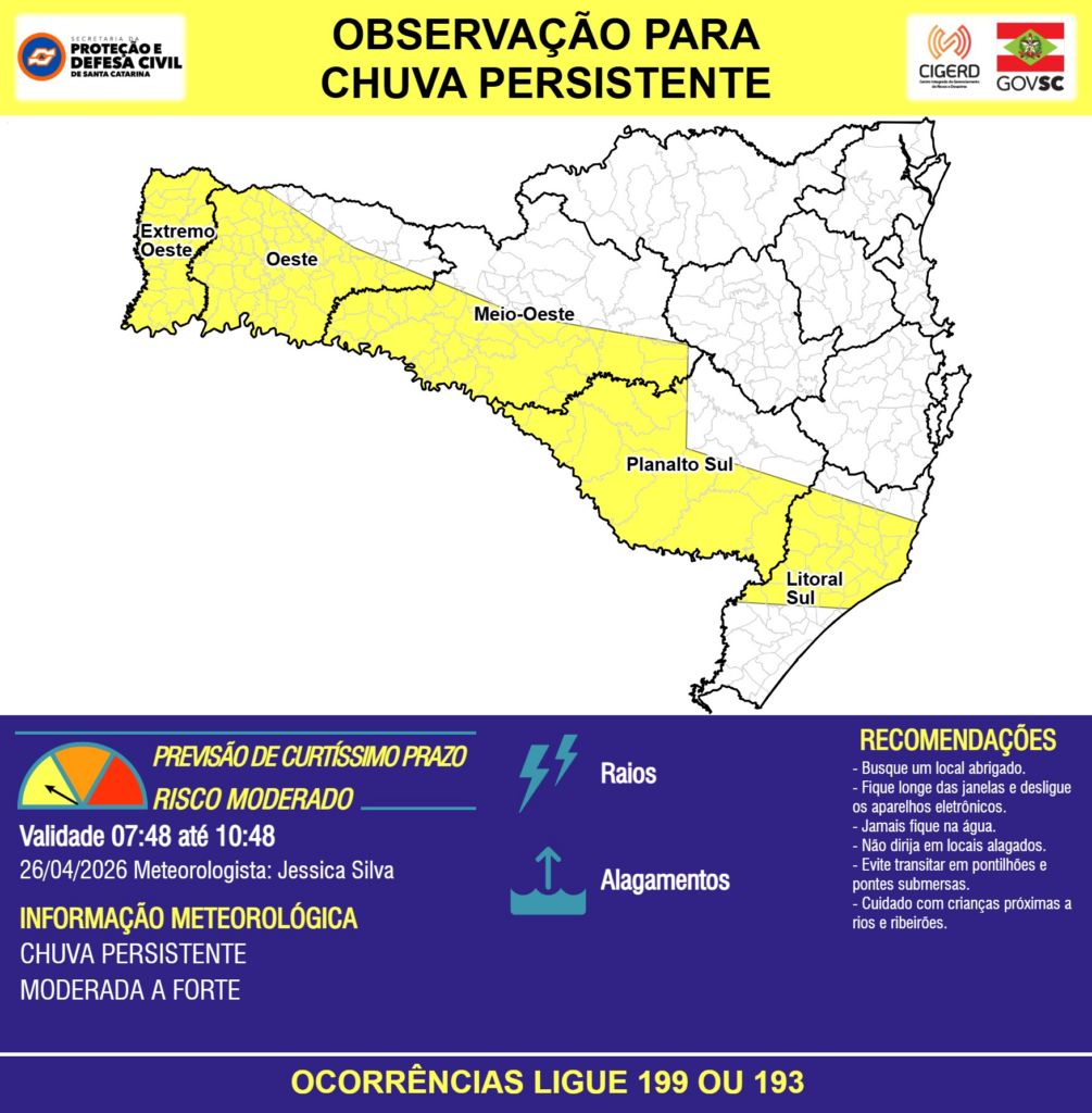OBSERVAÇÃO – 26/04 07:48 – CHUVA PERSISTENTE de intensidade moderada a forte com RAIOS e ALAGAMENTOS pontuais para as regiões do Extremo Oeste, Oeste, Meio-Oeste, Planalto Sul e Litoral Sul nas próximas 3 horas. Ocorrências ligue 199 ou 193.