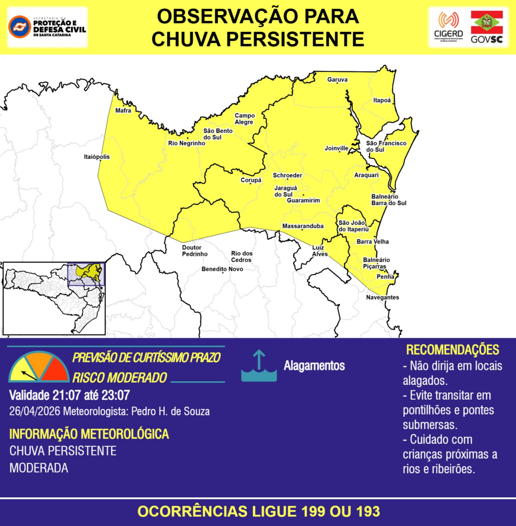 OBSERVAÇÃO – 26/04 21:07 – CHUVA PERSISTENTE de intensidade moderada com ALAGAMENTOS pontuais para os municípios de Araquari, Balneário Barra do Sul, Balneário Piçarras, Barra Velha, Benedito Novo, Campo Alegre, Corupá, Doutor Pedrinho, Garuva, Guaramirim, Itaiópolis, Itapoá, Jaraguá do Sul, Joinville, Luiz Alves, Mafra, Massaranduba, Navegantes, Penha, Rio Negrinho, Rio dos Cedros, Schroeder, São Bento do Sul, São Francisco do Sul e São João do Itaperiú nas próximas 2 horas. Ocorrências ligue 199 ou 193.