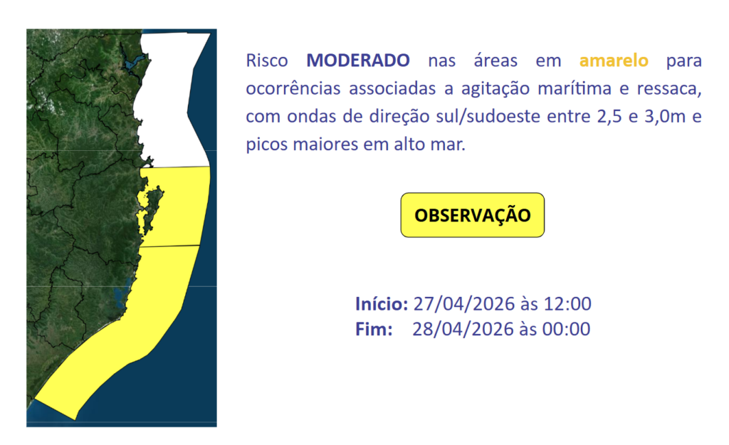Entre essa segunda (27) e terça-feira (28) o vento de quadrante sul ganha força na costa de Santa Catarina entre o Litoral Sul e a Grande Florianópolis, com vento médio entre 20-30 km/h e rajadas entre 40-60 km/h. Com isso o mar fica agitado com ondas de sul/sudoeste entre 2,5 e 3,0m e picos maiores em alto mar. O risco é MODERADO para ocorrências associadas à pesca e navegação e esportes náuticos.