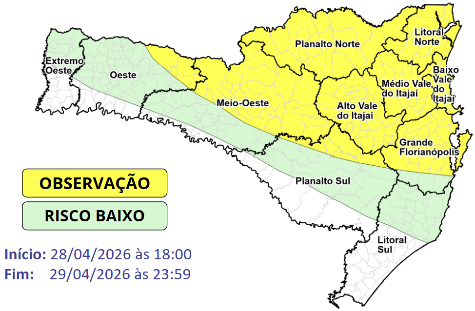 A partir da noite desta terça (28) e no decorrer da quarta-feira (29) as instabilidades voltam a aumentar em Santa Catarina, favorecendo o desenvolvimento de chuva pontualmente intensa e temporais isolados especialmente do centro ao litoral catarinense. O risco é BAIXO a MODERADO para ocorrências associadas a alagamentos e enxurradas pontuais, queda de galhos e árvores, destelhamentos e danos na rede elétrica.