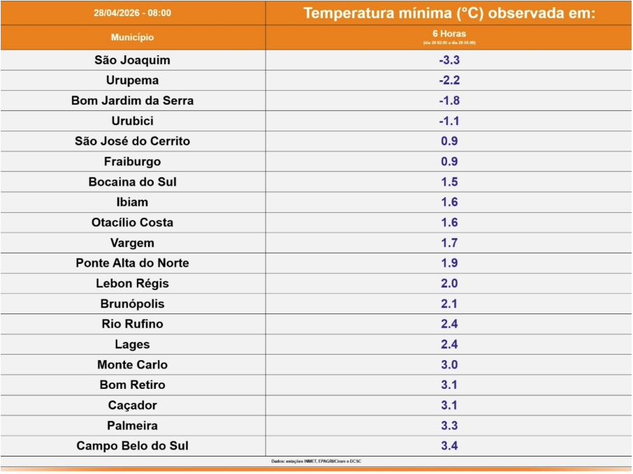 Confira as menores temperaturas registradas em Santa Catarina na manhã desta terça feira:
