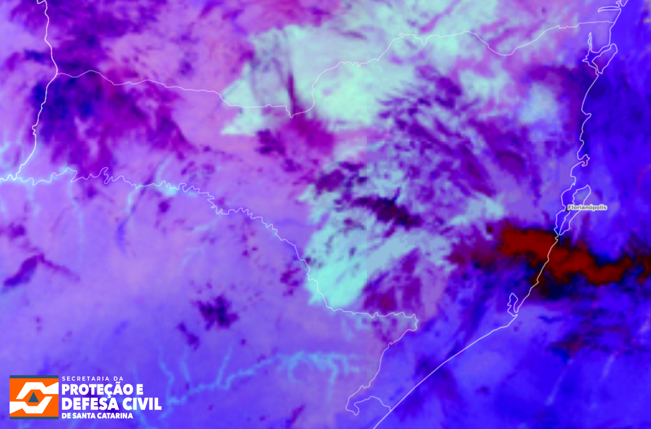 Figura: Imagem do satélite GOES-19, produto Nighttime Microphysics, às 05h00, horário local. Fonte: DSAT/CPTEC, adaptado por SDC/SC. Meteorologista: Pedro Souza Monitoramento Meteorológico SDC/SC 29/03 05:15 A madrugada deste domingo (29)…